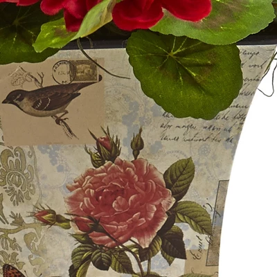 This pair of Geraniums is bold and beautiful. Its bright colored petals and green leaves create contrast with the muted colors on the floral planter. The intricacy of the Geraniumβs petals adds texture and depth to the arrangement. Perfect for end tables, bookshelves, night tables, and more.