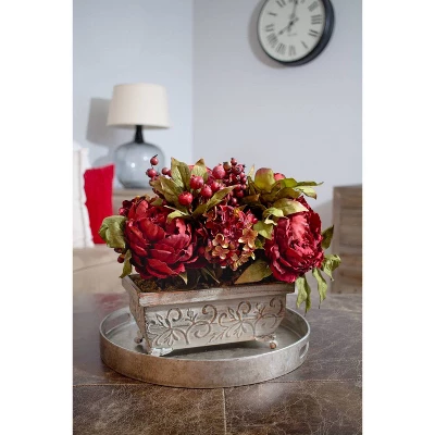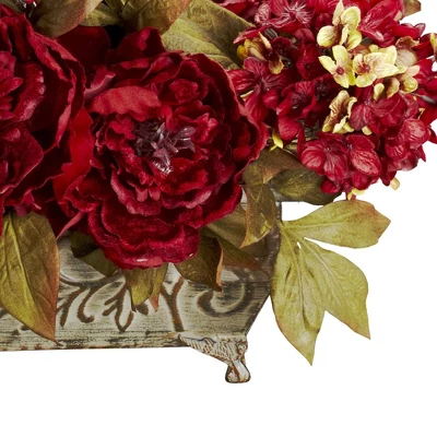 Give your home a warm welcoming vibe with this Peony & Hydrangea Silk Flower Arrangement from Nearly Natural. The perfect blend of compact size and beautiful holiday color, this floral combination works well to create a festive appeal. Featuring big red blooms, smaller petals and gold-hued leaves that has this arrangement look great wherever you choose to place it.