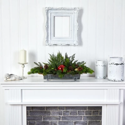 Set the scene during the holidays with this Cedar Pine, Pinecones, and Ornaments Artificial Christmas Arrangement. Handcrafted by stylists and inspired by nature, realistic-looking cedar is accented by pinecones and glossy ornaments for a bit of holiday cheer. With a length of 24in. and housed in a decorative vase, house in any table that needs a Christmas touch. House in a mantel, dinner table or foyer. Artificial arrangements are manufactured using synthetic materials, such as polyester material or plastic, and are well designed and constructed to be life-like in appearance. This item will need to be re-shaped when removed from the secure box to allow it to reach its fullest size. Your arrangement will look beautiful for years to come; simply wipe clean with a soft dry cloth when needed.