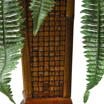 The perfect way to bring the forest indoors. This Boston Fern with Wood Vase Silk Plant from Nearly Natural is sure to add an abundance of color and greenery to your home or office decor. Dream of a vacation in the tropics as you gaze at this beautifully tailored creation. Featuring bright green leaves sprouting forth, go ahead and inspire a look that is both eclectic yet attractive. Make use of the stylish wood vase that adds a touch of oriental appeal to your decor; a definitive style statement.