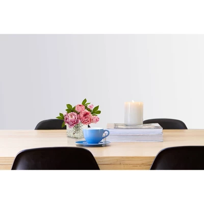 Layers of pink toned petals mix with deep green foliage for a full bloom arrangement. Paired with an elegant, textured glass vase to draw the eye in. Place in a powder room or as a centerpiece in a dining room.